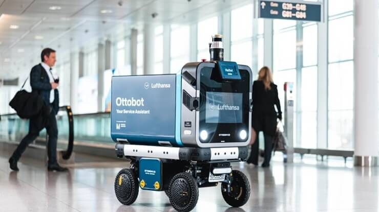 Lufthansa в международном аэропорту Мюнхена. Сканируя QR-код на роботе с помощью своего телефона, пассажиры