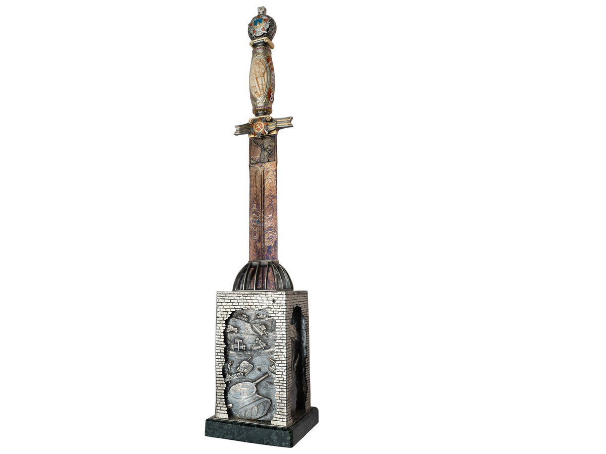 Композиция посвящена победе Советского народа в ВОВ Клинок изготовлен из термооксидированной дамасской стали, выкованной специально для этой композиции. Рисунок на стали символизирует салют. С обеих сторон основания клинка вырезаны знаменитые сюжеты – водружение советского флага на рейхстаг и зов комбата в атаку. Материалы рукояти – серебро, бивень мамонта, цирконий, эмаль. Рукоять изготовлена в виде колонны. Крестовина рукояти изготовлена в виде георгиевской ленты с орденами отечественной войны, навершие - с орденами Победы в обрамлении лавровых и дубовых веточек и звездами. На вставках из бивня мамонта вырезаны с одной стороны монумент «Родина-мать», с другой стороны монумент советскому воину в Трептов парке в Германии. По бокам рукояти на серебре вырезаны с одной стороны портрет Сталина, скрещенные автомат и винтовка и надписи: «Мы победили» и «80 лет Победе», с другой стороны портрет Жукова, скрещенные автомат и винтовка и надписи: «Слава героям» и «80 лет Победе». Материалы подста