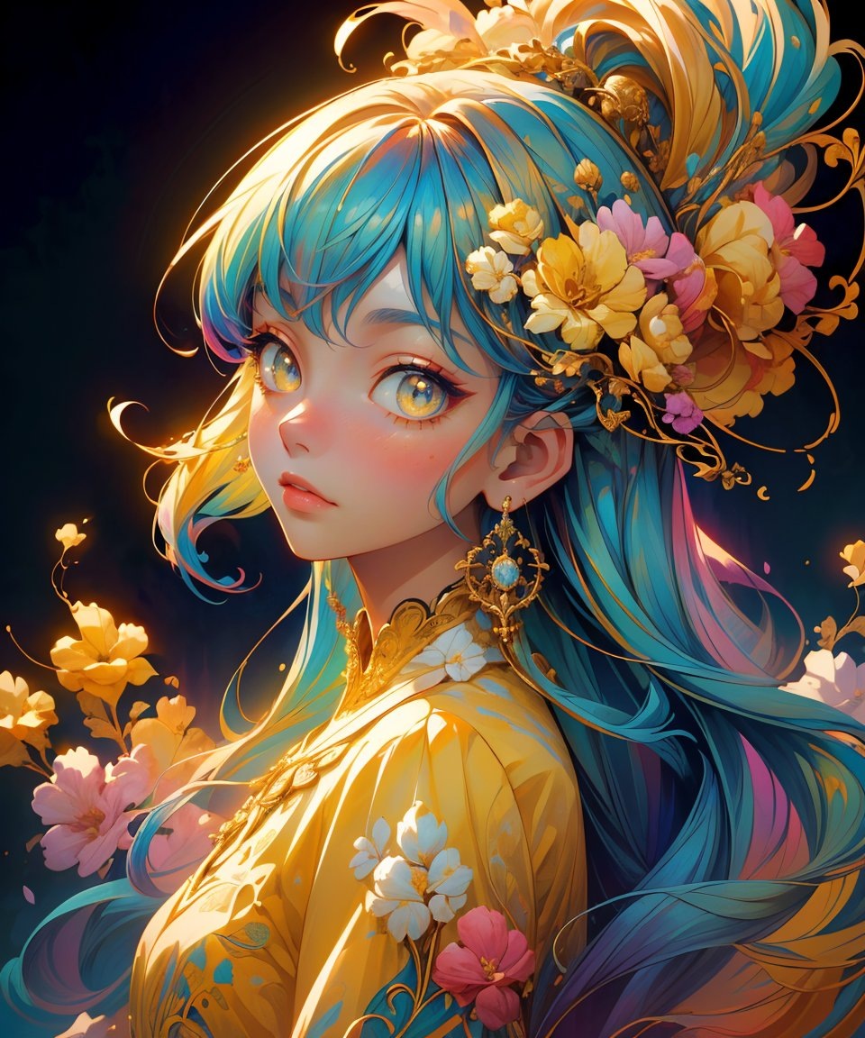 (лучшее качество, шедевр, официальное искусство, красиво и эстетично:1.2), 8k, супердетализация, боковой ракурс, фэнтези, 1 девушка, канадка, светлая кожа, <lora:md1:0.7> , (серьги, украшения для волос), смотрит на зрителя, ветер, цветы, замысловатый фон, чрезвычайно подробно, (фрактальное искусство:1.2), красочный, (грязно-желтый), красочный шум, визуальный хаос, современная эстетика, кинематографический LUT, <lora:more_details:0.4>, <lora:Dreamwave v3:0.2>, <lora:fractalfantasy:0.6>, <lora:GoodHands-beta2:0.7>