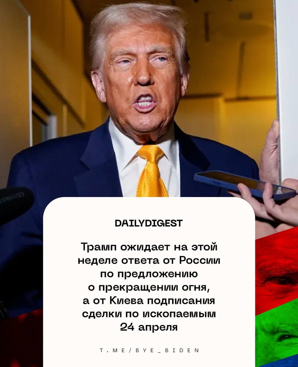 ☑️ Главные новости на утро 18 апреля: 🔹Трамп ожидает на этой неделе ответа от России по предложению о прекращении огня, а от Киева подписания сделки по ископаемым 24 апреля. 🔹В Венесуэле в честь 80-летия победы Красной армии в Великой Отечественной войне возведут памятник. 🔹Трамп на фоне торговой войны заявил, что сделка с Китаем может быть заключена в ближайшие три-четыре недели. 🔹Овечкин обновил свой рекорд по заброшенным шайбам в НХЛ: в гостевом матче с «Питтсбург Пингвинз» он довел число заброшенных шайб до 897. 🔹Принятие документа СБ ООН в поддержку возможного прекращения огня на Украине будет зависеть от условий перемирия — Небензя. 🔹ВС США сообщили об уничтожении йеменского порта Рас-Иса, расположенного в провинции Эль-Ходейда на побережье Красного моря. 👍 БайБайден. Подписаться