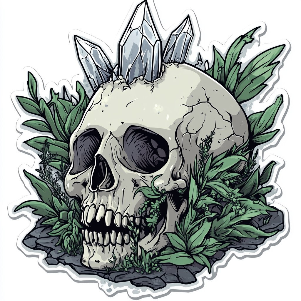 Создано на основе запроса: A human like skull, forgotten to time, crystallized form emerge from the top as plant life grows around it. Vector style, die cut sticker --- Автоперевод: Человек, похожий на человека, забытый во времени, кристаллизованная форма появляется с вершины по мере роста жизни растений. Неплохо получилось? 🤔 https://dzen.ru/id/65c0c65c86e4f837c27b24d7 #ИИ #AI #нейросеть #midjourney #art