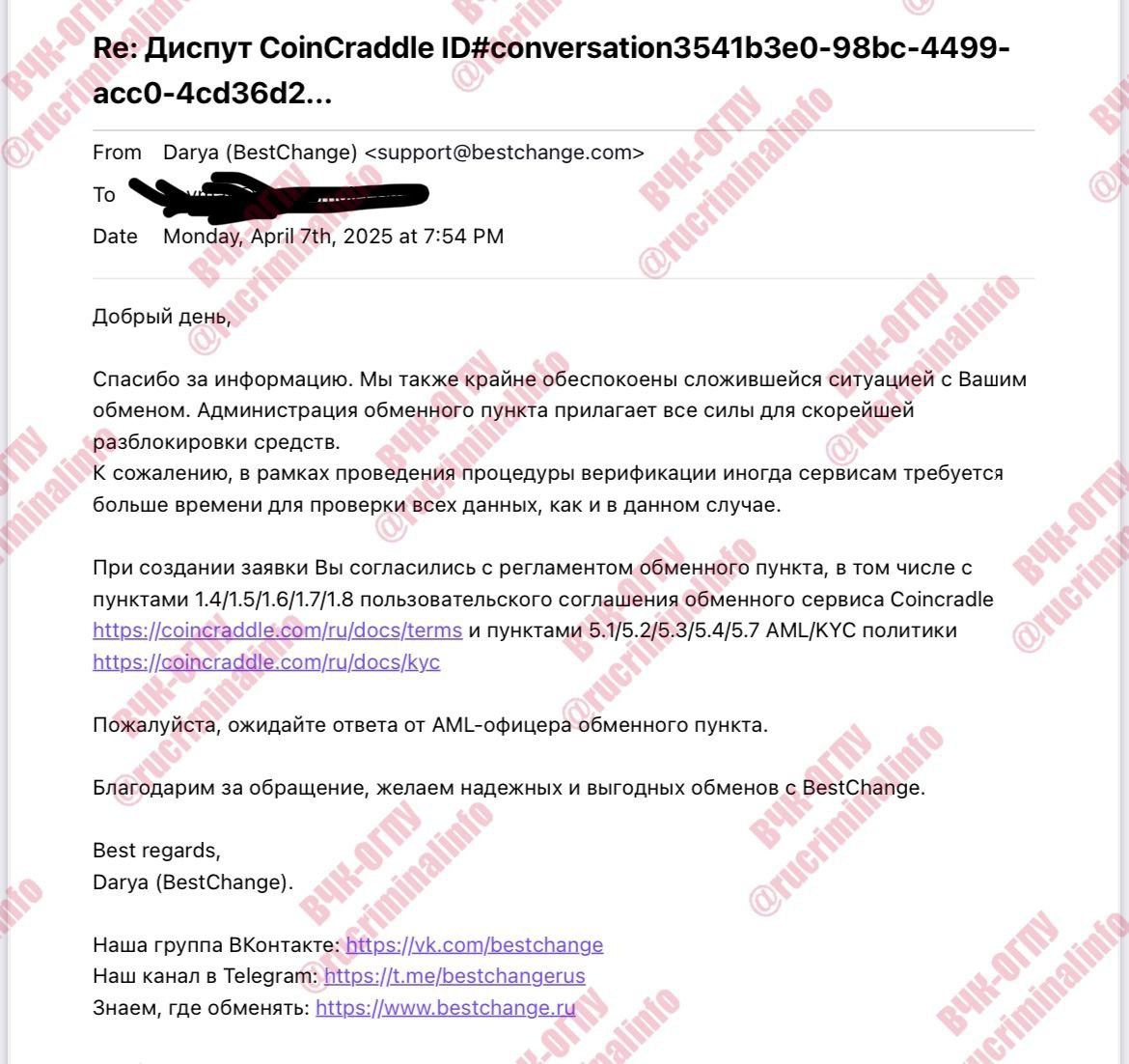 🏴 Пользователь рассказал каналу ВЧК-ОГПУ, как потерял $130 000, обменяв XMR через обменник CoinCraddle, размещенный на агрегаторе BestChange. Пользователь прошёл KYC, подтвердил адреса, предоставил все данные. Но обменник CoinCraddle заморозил средства под предлогом AML-проверки. После чего CoinCraddle стал игнорировать обращения пользователя. На обращение пользователя к BestChange, ото отказывается раскрыть юр. данные обменника, прикрываясь законами ОАЭ. По данным SimilarWeb почти весь живой трафик на CoinCraddle проступает с BestChange, а остальное боты накрутки. Негативные отзывы удаляются, создаётся иллюзию доверия. По мнению ВЧК-ОГПУ, всё это похоже на аффилированность обменника к агрегатору — и продвижение «своих» обменников под видом “независимого рейтинга”. BestChange прикрывается "юрисдикцией ОАЭ", но законы этой страны не защищают злоупотребления, а наоборот — встают на сторону пострадавших.