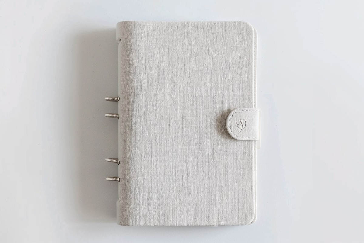 Создано на основе запроса: a soft ivory or light gray fabric-covered ring-bound planner, closed, top-down view of the front cover with