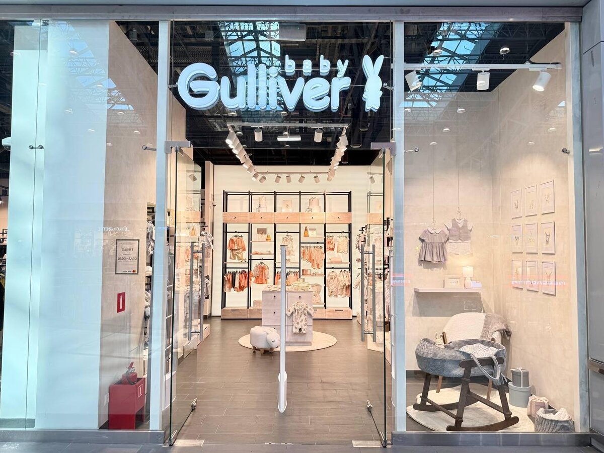 Gulliver пробует новый подход в детском ритейле, открыв в ТРК "Питер Радуга" компактный отдел с отдельным входом. Над дверью — логотип Gulliver с приставкой Baby и симпатичным мишкой зайчиком.