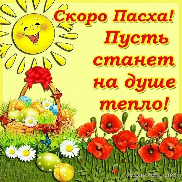 Пасха в гости к нам спешит, Всем готовиться велит! Дом скорее убирайте, Куличи вы выпекайте, Сердце, душу очищайте И священный день встречайте! Пусть Господь подарит благость, Счастье каждому и радость! Пусть наступающий праздник принесет в ваш дом счастье, мир, гармонию и душевное равновесие. Пусть в душе всегда царят любовь, радость и спокойствие. Будьте здоровы, удачливы, и пусть сбудется всё то, о чём просит сердце! Со Светлой Пасхой, друзья!