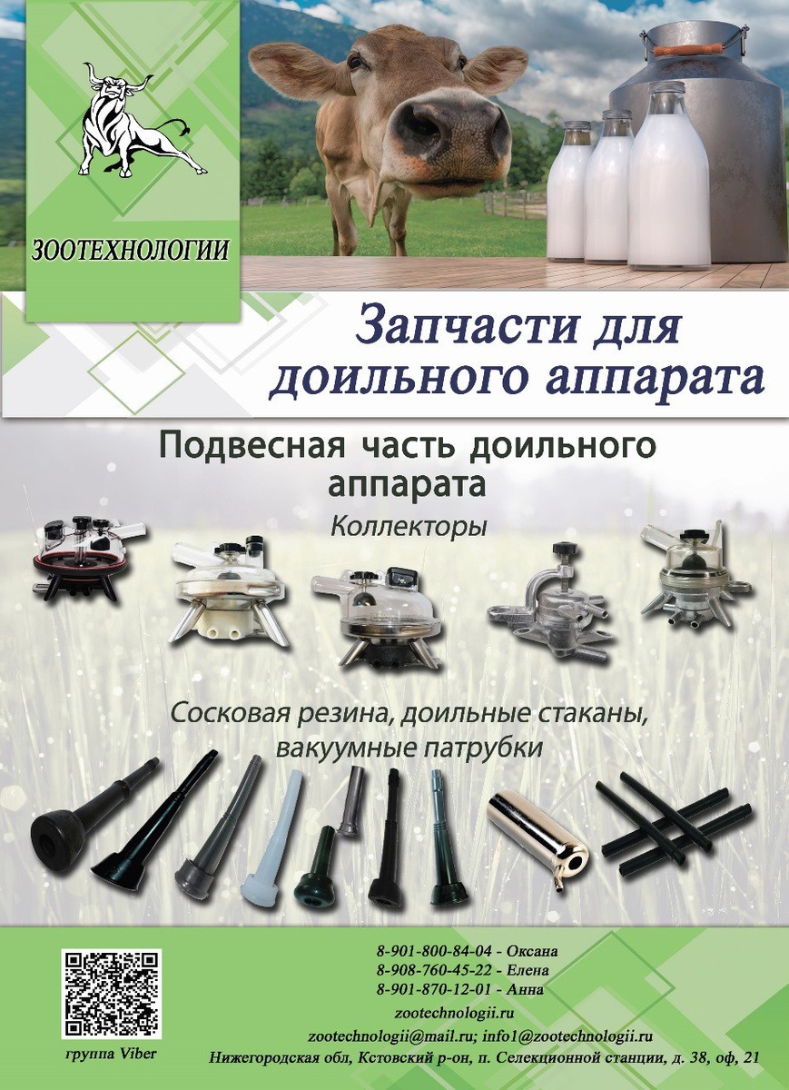 📌 Представляем Вашему вниманию широкий ассортимент запасных частей для доильного оборудования. ✔️Сосковая резина; ✔️ Пульсаторы; ✔️ Коллекторы; ✔️ Краны; ✔️ Муфты; ✔️ Насосы. Все интересующие вопросы Вы можете задать нашим менеджерам: 📞8-908-760-45-22 - Елена 📞8-901-800-84-04 - Оксана 📞8-901-870-12-01 - Анна 📞8-902-787-47-33 - Юлия Либо, пишите нам на электронную почту: ✉️ zootechnologii@mail.ru Читайте нас в Дзен✔️