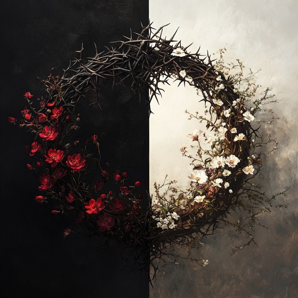 Создано на основе запроса: Half the image is a dark crown of thorns and the other half of the image has flowers and life growing from it