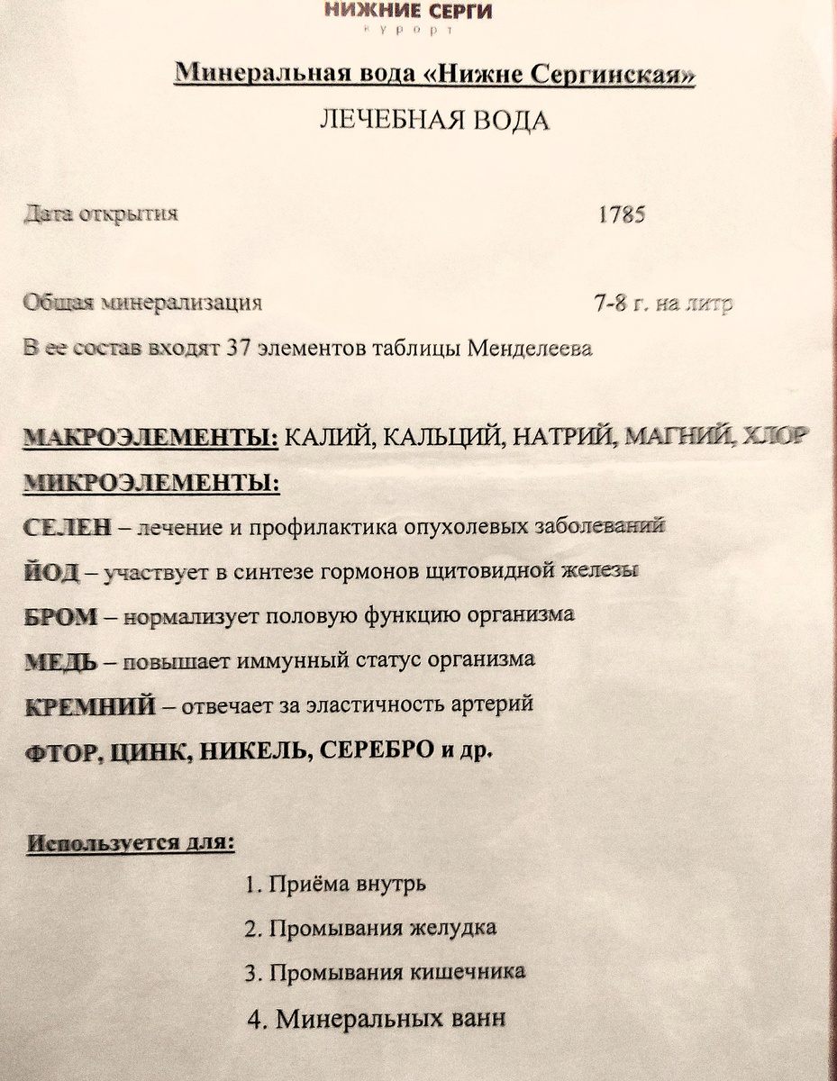 ☝️ Основной лечебный фактор курорта — природная хлоридно-натриевая минеральная вода «Нижнесергинская».
