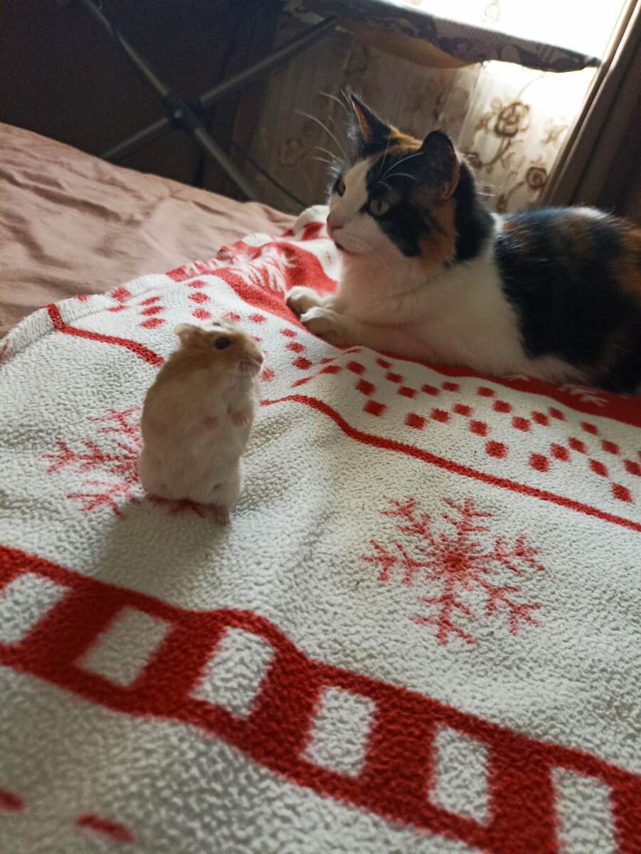 Хомочка моя жива и невредима, Ася не кровожадная, и своих не ест, но если забежит в дом чужая мышь...