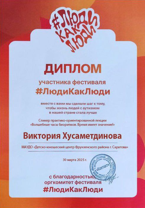 ДЮЦ: НАУКА Виктория Хусаметдинова выступила спикером авторской практико-ориентированной лекции "Волшебные часы биоритмов. Время имеет значение!" на международном форме #ЛюдиКакЛюди в Москве. В настоящее время Виктория Анатольевна ведет научную деятельность и возглавляет работу Региональной исследовательской площадки ДЮЦ. Ближайший семинар для социальных партнеров площадки состоится 22 апреля в 14:00. Не упустите возможность лично пообщаться с экспертом, задать вопросы и подключиться к научной деятельности. #ДЮЦнаука #ДЮЦРИП