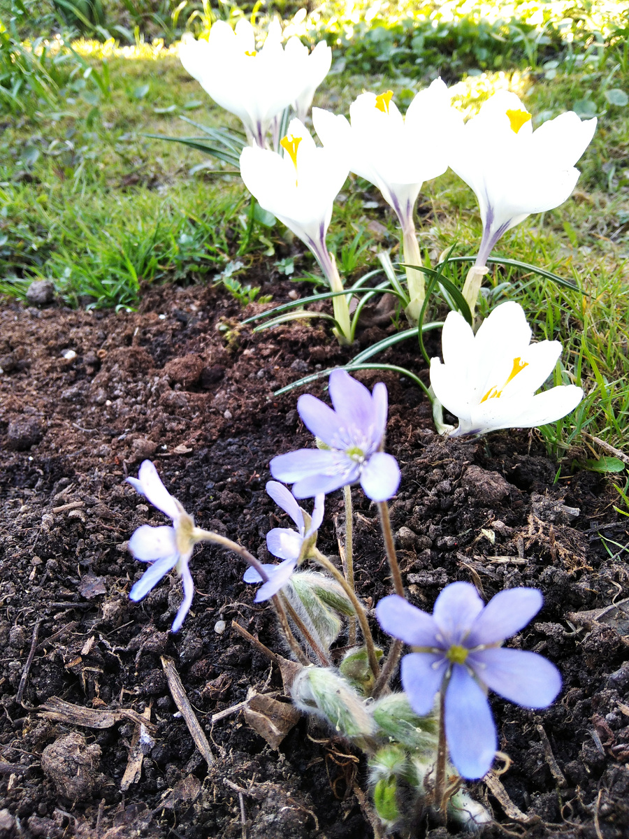 В Московский регион пришло лето (ненадолго), поэтому садовый пейзаж стремительно хорошеет, становится всё ярче. Печёночница, увы, не моя. Точнее, теперь уже моя, я её вчера купила и посадила рядом с белыми крокусами. Это уже, наверное, четвёртая или пятая попытка завести в саду этот милый цветочек. Не живут они у меня почему-то! Год, два - и уходят. Но я упорно пытаюсь с ними подружиться. Вот благородную печёночницу купила, и трансильванская ко мне уже едет. Зацвела новинка - сцилла Розеа. Скажем прямо, розовый цвет в ней еле-еле угадывается. Но симпатичная! Пожалуй, надо будет трансильванскую печёночницу рядом с ней посадить, реснички (тычинки) у них похожи. Медуница зацвела под ёлкой. Пушкинии - обычная, с голубой полосочкой, и чисто белая. Вам какая больше нравится? Мне первая! Анемона дубравная по всему саду у меня цветёт. Сейчас обратила внимание, что куртина интересно выглядит: цветки смотрят в одну сторону и образуют плоскость. Часть крокусов уже отцвела, а эти как раз на п