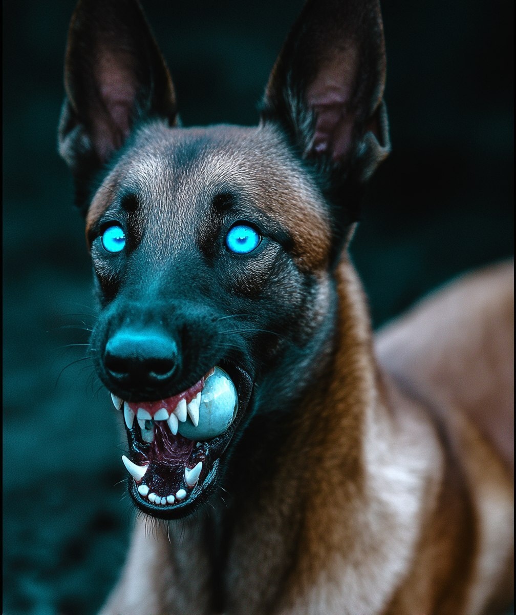 Создано на основе запроса: The Flying Belgian Malinois crazy big teeth Great white shark eyes