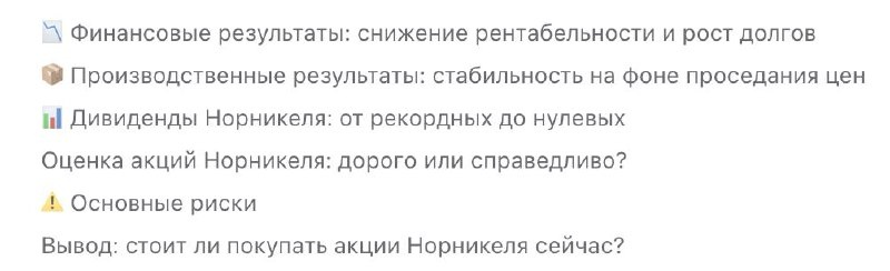 А Норникель жив и есть ли смысл держать акции в 2025 году? Разобрал последнюю отчётность крупнейшего производителя никеля и палладия и заметил тенденции последних лет: — Прибыль упала в 3,5 раза — Долг вырос до 826 млрд ₽ — Дивиденды не платят второй год подряд — FCF почти на нуле Детальный разбор можно найти в новой статье :)