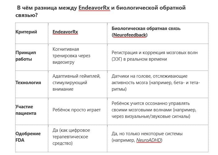 EndeavorRx — первая игра для лечения СДВГ Раз уж США – «родина» СДВГ как диагноза, им и быть впереди планеты всей😉 В 2020 году Управление по санитарному надзору за качеством пищевых продуктов и медикаментов США (FDA) одобрило первый в мире игровой терапевтический метод. EndeavorRx (AKL-T01) — это мобильная игра, разработанная компанией Akili Interactive для детей 8–12 лет с СДВГ. Цель – улучшить внимание и концентрацию. 1️⃣Форма лечения через игру - Ребёнок управляет персонажем, который летит на летательном аппарате, собирая цели и избегая препятствий. - Геймплей требует постоянного фокуса, многозадачности и быстрой реакции. 2️⃣Адаптивная сложность - Алгоритмы подстраивают уровень сложности под каждого пользователя, чтобы поддерживать оптимальную нагрузку на мозг. 3️⃣Научная основа - Разработана при участии нейробиологов и врачей. - Влияет на дорсолатеральную префронтальную кору (область мозга, связанную с вниманием). 4️⃣Курс лечения - Рекомендуется 5 дней в неделю по 25–30 мин
