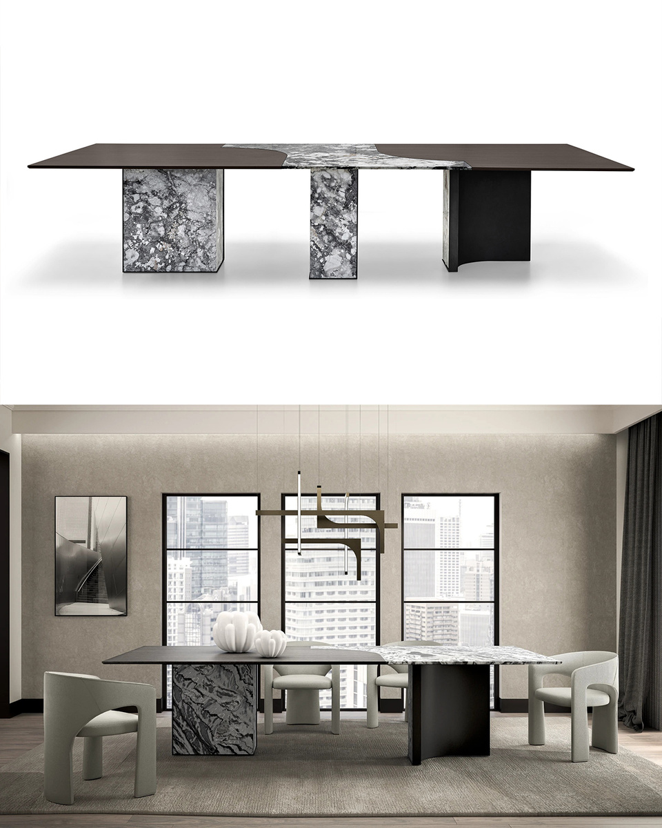 Среди итальянских новинок, — стол Millennium от нашей дилерской фабрики Arketipo. Дизайнер Джино Каролло заложил в эту модель больше, чем просто форму: он попытался уловить ощущение надежды и обновления, которое сопровождает каждый новый виток времени. Millennium — это минимализм новой волны, в котором простота не исключает выразительности. Массивная столешница из мрамора в паре с древесиной создаёт контраст, подчёркивая тактильность и фактуру материалов. При этом сам контраст не ради эпатажа — он создаёт баланс и глубину. Ножки выполнены из металла с мраморными вставками — лаконичная геометрия с благородным акцентом. Такой приём придаёт столу основательность, не нарушая его визуальной лёгкости.