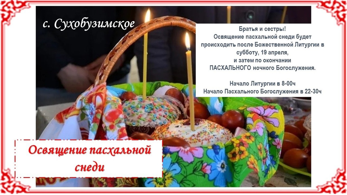 19 апреля, в субботу, в храмах Сухобузимского района в 8:00 пройдёт божественная литургия, по её окончании будут освящаться куличи и яйца. В 22:30 начнётся полунощница с каноном Великой субботы, в 23:15 – крестный ход, Пасхальная литургия, освящение пасок, куличей, яиц и снеди.