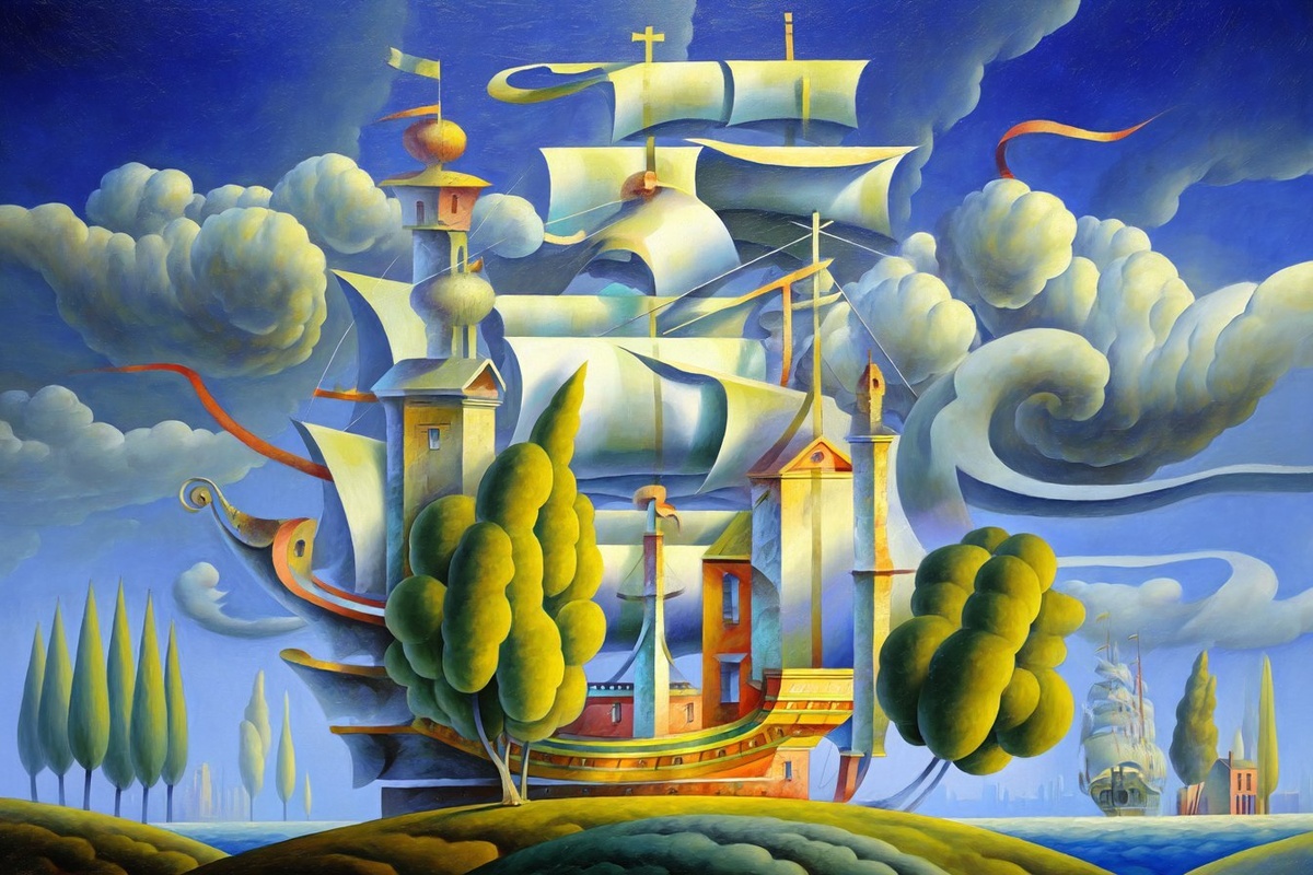 Создано на основе запроса: georgy kurasov paintings style, surrealism in color, treasure island, hdr, highly detailed, style raw