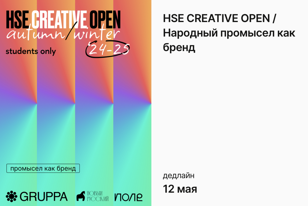 Участвовать могут студенты с проектами самого разного рода — от медиа и событий до собственных брендов. Главное здесь не формат, а то, как вы работаете с локальной культурой: традиционными ремеслами, визуальными кодами мест, материалами и техниками, которые несут в себе культурную память. Это может быть и современная интерпретация промысла, и проект, вдохновленный региональной идентичностью. Словом, если вы умеете услышать в палехской миниатюре будущий комикс, а в хохломской росписи — паттерн для коллекции одежды, то вам точно сюда. Судить будет жюри с широким кругозором и хорошим вкусом: преподаватели Школы дизайна, сотрудники Всероссийского музея декоративного искусства, создатели творческой студии GRUPPA, команда фонда «Поле» (развивают национальную культуру и ремесла), представители Гжельского завода, Хохломы и вологодского музея кружева. А еще — основатель «Всемирного фестиваля Моды Кочевников». Впечатляет, правда? Прием заявок открыт до 12 мая. Подумайте: вдруг ваш дипломный прое