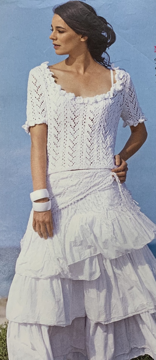Здравствуйте милые рукодельницы! Скоро лето! Летом как никогда актуален белый цвет. Хочу предложить вашему вниманию модели, связаны они спицами. Ажурные узоры придают легкости вязаным изделиям. Приталенный ажурный пуловер с короткими рукавами, впечатляет глубоким вырезом горловины, края которого окаймляют связанные крючком цветы - чуть крупнее тех, которые расположились на рукавах. Оригинальным дополнением является набедренный треугольный платок с бахромой, связанный узором из листьев. Размер: 36/38(42/44)48/50 Материалы: пряжа - 600(700)800 г; спицы 4.5мм, крючок 3 и 4 мм Платочная вязка: лиц. и изн. р. - лиц. п. Лицевая гладь: лиц. р. - лиц. п., изн. р - изн. п. Ажурный узор: число петель кратно 13+4+2 кром. Вязать по схеме 1. Узор из листьев: число петель кратно 14+1+2 кром. Вязать как ажурный узор, но по схеме 2. Маленький цветок: крючком набрать цепочку из 6 п. и соединить в круг. Вяжем по кругу: 1 возд. п, 1 полуст., 1 ст. с/н, 1 полуст., 1 ст. б/н, * 1 ст. б/н, 1 полуст., 1 ст