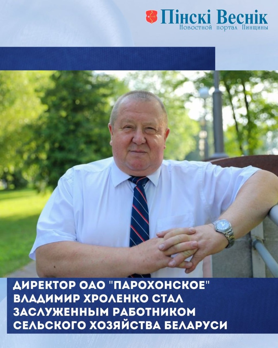 Директор ОАО "Парохонское" Владимир ХРОЛЕНКО стал заслуженным работником сельского хозяйства Беларуси. Почетное звание присвоено Указом Президента Беларуси Александра Лукашенко, который глава государства подписал 17 апреля. @Пинский Вестник ЮТУБ | САЙТ| ИНСТ | ВК | ОК | ФЕ | Прислать новость