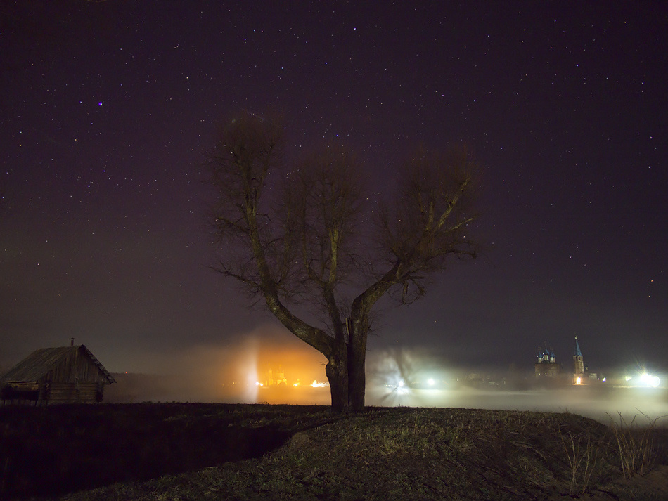 На Пасхальную неделю пришлась мощная магнитная буря, и был дан благоприятный прогноз на северное сияние. Погода для наблюдения и фотографирования стояла идеальная. Решил я еще раз попытать счастья. О предыдущей попытке увидеть северное сияние на канале был рассказ. В общем, в ночь со среды на четверг направился я в Дунилово. Прибыл на свой наблюдательный пункт в районе половины одиннадцатого вечера. Начал со съемки своей любимой липы на фоне звездного неба. Стало очевидно, что на небе что-то происходит. Оно было заметно окрашено в темно-лиловый цвет. Специально посмотрел таблицу цветов, чтобы дать правильное название цветовому оттенку. Участок неба ближе к горизонту имел зеленоватый оттенок. Небо определенно играло красками. Стало ясно, что сияние началось, и стоило поспешить переместиться на основную локацию. Прежде чем покинуть наблюдательный пункт, сфотографировал окутанные туманом дуниловские храмы на противоположной стороне. Первый кадр с главной позиции сделал в 23:49. Небо пока