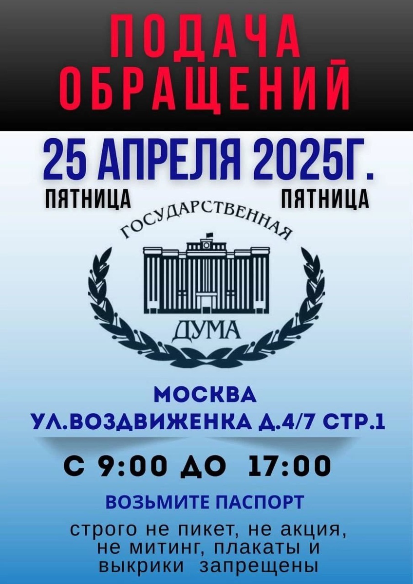 ⚠️⚠️⚠️ВНИМАНИЕ⚠️⚠️⚠️ 🔴25 апреля с 09:00 до 17:00 пройдет Подача Обращений ко всем Руководителям всех Партий ГосДумы России. 🔴Подача состоится по адресу: город Москва, улица Воздвиженка, дом 4/7 стр. 1 🔴Важно отметить, что это не митинг, не пикет, не акция, плакаты и выкрики строго запрещены. 🔴При себе иметь паспорт. ⚠️Подача обращений нужна для ознакомления Глав Партий Думы с актуальной и правдивой информацией в сфере обращения с животными. #ПротивЭвтаназии #ПротивЭвтаназииЖивотных #ЗаЖизнь #МыНеОтступим #Россия #РоссияБезЖестокости #СобакаДругЧеловека