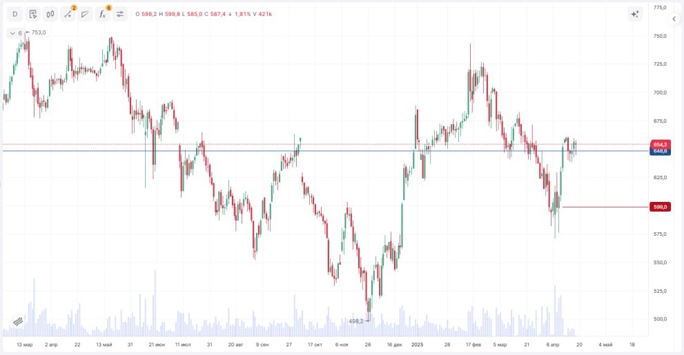 📈 «Татнефть» ап Тикер: #TATNP Идея: Long ⬆️ Срок идеи: 2-4 недели Цель: 750 руб. Потенциал идеи: 14.6% Объем входа: 7% Стоп-приказ: 599 руб. 📊 Технический анализ Акции преодолели уровень сопротивления 648.6, сформировав разворотный сигнал. При объеме позиции 7% и выставлении стоп-заявки на уровне 599 руб. риск на портфель составит 0,59%. Соотношение прибыль/риск 1,74. ⛽️ Фундаментальный фактор #Татнефть – одна из крупнейших российских нефтяных компаний, в составе которой динамично развиваются нефтегазодобыча, нефтепереработка, нефтегазохимия, сеть АЗС, композитный кластер, электроэнергетика, разработка и производство оборудования для нефтегазовой отрасли и блок сервисных структур. Компания может стать одним из бенефициаров потенциального роста цен на нефть как в рублях, так и в долларах. Наилучшая динамика выручки (+27,8%) и чистой прибыли (+6%) по итогам 2024 года в нефтегазовом секторе РФ. 💡 AI-скринер Проверьте инвестиционную идею по TATNP с помощью искусственного интеллекта