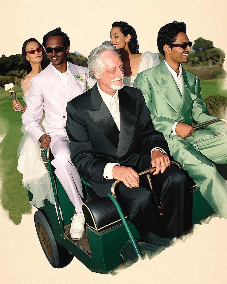 Создано на основе запроса: A gentleman riding an elephant with his fashionable friends