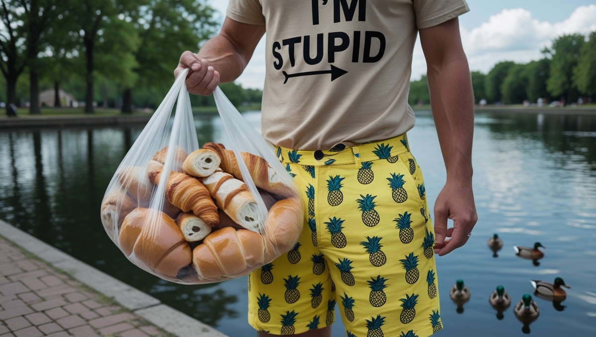 Всё началось невинно: я шёл в парк, чтобы покормить уток. Ну, знаете, как обычный человек... если обычный человек берёт с собой вместо хлеба целую булочную. Я буквально тащил огромный пакет с булочками, круассанами и зачем-то одной пиццей. На случай, если утки — гурманы. И тут я вижу толпу. Музыка. Шары. Люди в костюмах. Свадьба! Я подумал: «О, класс, утки подождут. Пойду посмотрю, как чужие люди делают глупости в красивых нарядах». Стою я такой весь неприметный, в ярко-жёлтых шортах с ананасами и футболке с надписью «Я тупой» (стрелка указывает на меня самого). И тут БАМ! Ко мне подлетает женщина в истерике: — О, Господи, ты приехал! Мы так тебя ждали! Наш тамада сломал ногу, и нам срочно нужен кто-то! Пожалуйста! ТЫ СПАСИШЬ НАШУ СВАДЬБУ! И тут я понял... Это мой момент! Моя слава! Моя минута Оскара и Тостмастера! Конечно, я сказал «ДА!» — так же быстро, как любой нормальный человек сказал бы «НЕТ!». Но кто я такой, чтобы быть нормальным? Через пять минут я уже стоял перед сотней чело