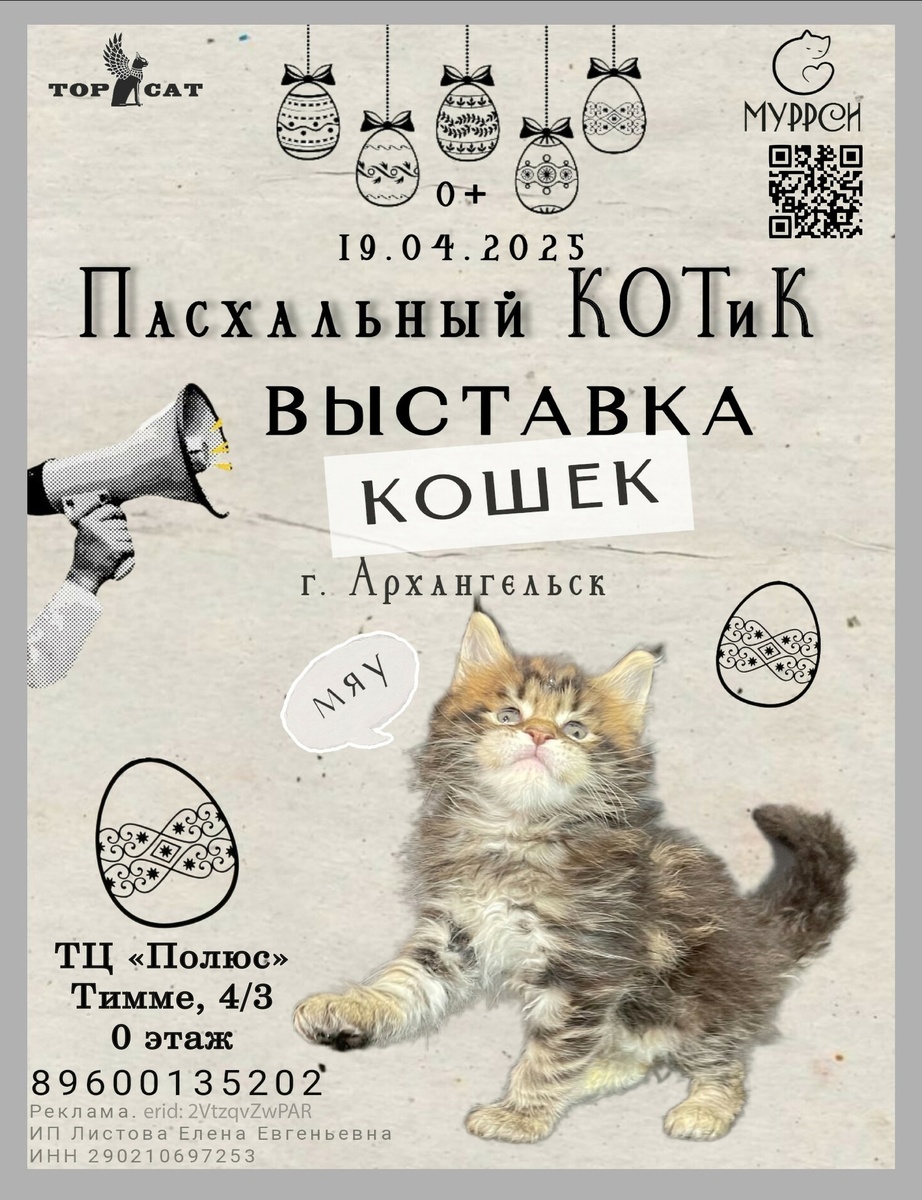 ⏰ 19 апр (1д) 🏛 #Архангельск #Россия #Выставка 😽 Выставка кошек и котов: ПАСХАЛЬНЫЙ КОТиК 🏆 Клуб любителей кошек "Муррси" Контакты организаторов здесь: 🌐 https://www.sunny-cat.ru/vystavki-koshek.php?mesto=11-arhangelsk 09:00 – Регистрация, ветконтроль 10:00 – Открытие выставки, представление экспертов, спонсоров 10:00 – 17:00 - Экспертиза 10.30 TopCat Ринг Домашних кошек 11.00 TopCat Ринг Взрослых 11.30 TopCat Ринг Кастратов 12.00 ТopCat Ринг Молодых 12.30 Шоу Длинная шубка 13.30 – 14.00 обед 14.00 Полосатое шоу – рисованных окрасов 15.00 Шоу Мистер Кот 15.30 Шоу Мисс Кошка 16.00 Солидное шоу (без рисунка) 16.30 Короткая шубка – короткошерстные кошки 18.00 – Best in show