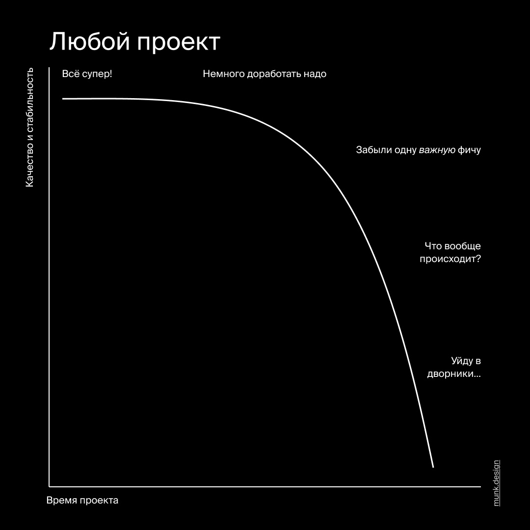 Работа с нейронками ещё раз показывает, насколько же фундаментальные и общие принципы есть в любой коммуникации. Чем больше кодишь с нейронкой, тем больше код превращается в переусложнённый и забагованный треш. Одно цепляется за другое, решаешь одну фичу, четыре других ломается. В итоге 90% работы — это починка того, что раньше работало. Усугубляет ситуацию ещё и то, что в процессе работы я тоже получаю новые вводные — понимаю, что надо сделать иначе, что не учёл или где ошибся. Поэтому меняю задачу на ходу. Энтропия нарастает — максимум хаоса, раздражает безумно. И напоминает мне весь этот бардак… обычную жизнь в миниатюре. Рядовой проект или бизнес. Давайте сравним: старт проекта, всё супер, всё нравится, в голове уже всё придумали. Первые результаты, если нравятся — супер, но есть пара правок. Что-то позабыли, но вспомнили — тоже добавим. Ошибка случилась, надо отвлечься и поправить. Умножьте это на количество людей в проекте — чем больше людей, тем больше неопределённости и транзак
