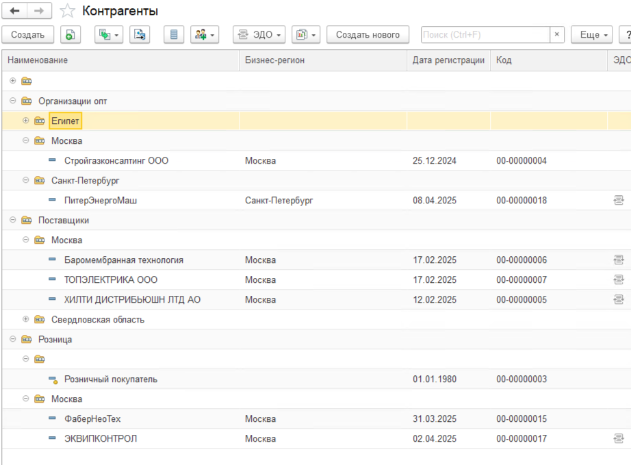Аналогичным образом можно настроить в справочнике Контрагенты любые группировки, необходимые в работе.