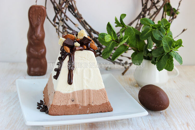 Шоколадная сырая творожная пасха — рецепт без яиц и без выпечки. На праздничном столе она будет смотреться нарядно, а вы сможете насладиться сразу тремя вкусами! Для приготовления понадобятся: творог (чем жирнее, тем нежнее получится пасха), сливки (любой жирности), сахарная пудра, масло, а также по половинке плитки черного, молочного и белого шоколада. Каждый из них придаст творожной массе свой особенный вкус и оттенок, пасха получится трехцветной и очень нарядной. Совет! Чтобы структура была интереснее, добавьте в белый слой — кокосовую стружку, в молочный — немного шоколадных капель, а в темный — дробленые орехи. Рецепт рассчитан на пасочницу среднего размера 6х12 см, высота 12 см. В качестве альтернативы можно использовать ведерко из пищевого пластика вместимостью до 700 мл (чтобы из него выходила сыворотка, на дне проделайте отверстия). Общее время: 24 часа | Время приготовления: 1 час