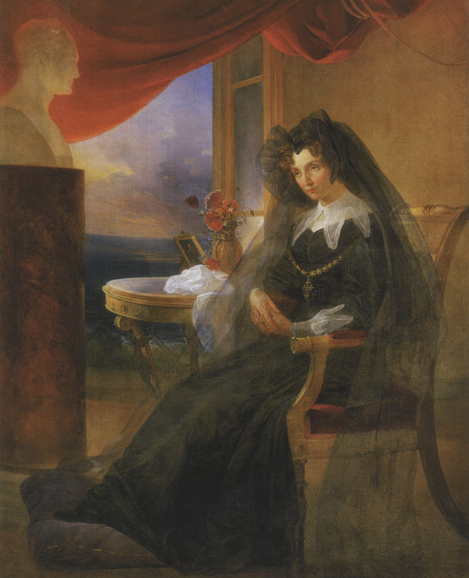 Портрет кисти П. Басина рисует нам императрицу Елизавету Алексеевну, урожденную принцессу Луизу Баденскую, уже вдовою императора Александра Первого и тонкий овал лица Государыни, ее фигура окутанная черною тафтой и вуалью, только подчеркивает ее хрупкость, истомленность горем, глубокую печаль, задумчивость и погруженность в себя...Даже подушка под ее ногами черного цвета. Контраст с ее нарядом составляют изысканный белый воротник и манжеты траурного платья. Они тоже- белые и так точно и ненавязчиво оттеняют бледность и нежность лица. Портрет словно вторит готико - романтической манере, традиции изображения королев Марии Стюарт, Елизаветы Тюдор, Генриетты Английской. Императрица погружена в тихие воспоминания перед бюстом императора, покорителя Наполеона.. Написание портрета датируется предположительно 1825 - 26 годом. Контрастом и сочетанием со заревом в открытом окне, выступает еще и занавес, цвет стен, как бы говоря, что жизнь Государыни - вдовы угасла, как закатное солнце, вместе с