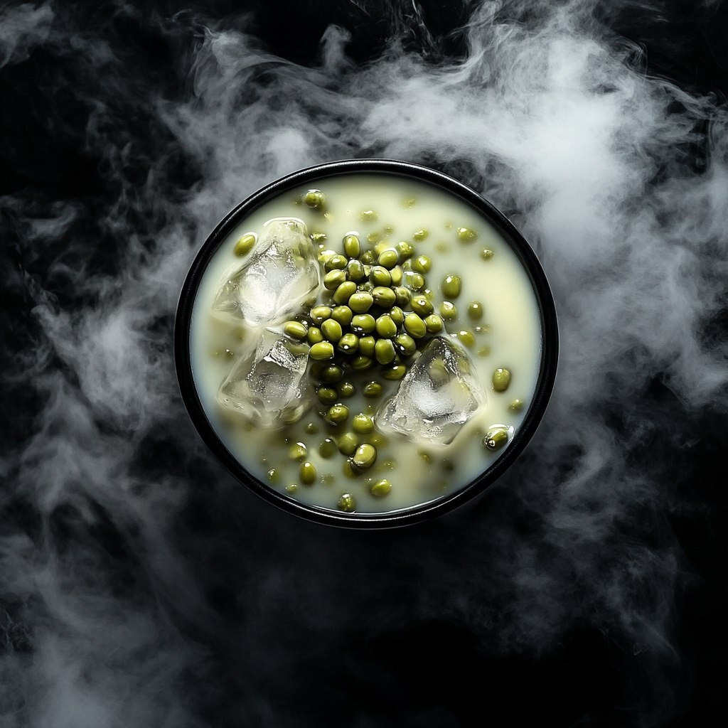 Создано на основе запроса: green mung beans and milk with ice, top view, black background, black foreground, smoke and mist around