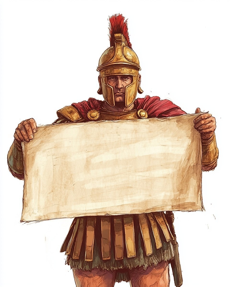 Создано на основе запроса: low-angle colorful sketch of a Roman soldier holding a large blank note, soldier is loosely detailed and slightly