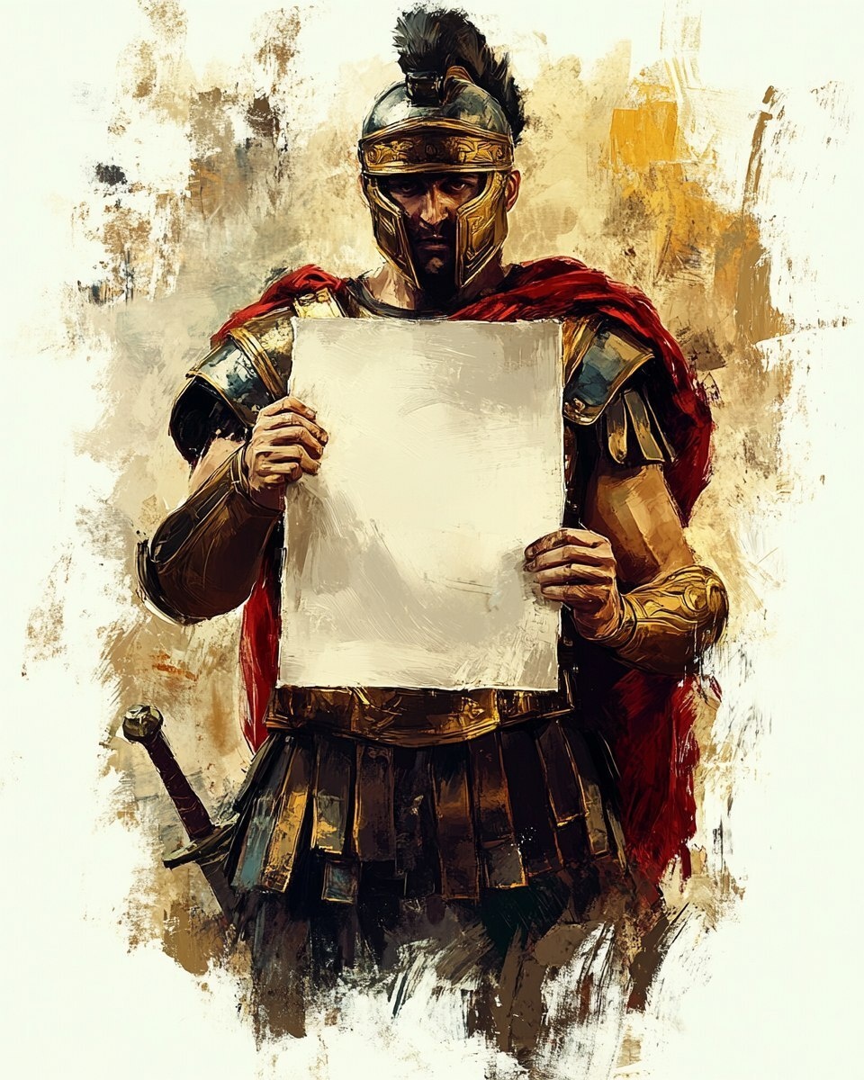 Создано на основе запроса: low-angle dramatic portrait of a Roman soldier holding a large blank note, face not visible (back turned or