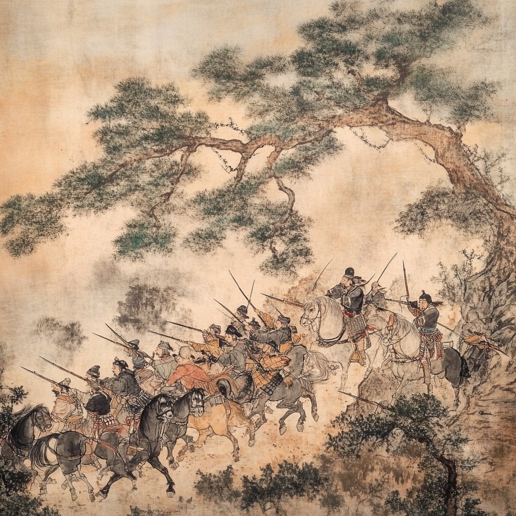 Создано на основе запроса: jappanese style tiger slashing tree sref Zaporozhian Cossacks slowly traveling together in a convoy, some on horseback, some walking, some riding on wooden carts. They carry weapons like sabers, muskets, and spears. The scene is placed compositionally near the top of the image, leaving open calm space below to evoke depth and airiness. Illustrated in soft pastel and chalk textures, inspired by East Asian picture book style. Gentle hand-drawn look, warm earth-tone palette, minimal background, soft edges, diffuse light, slightly textured paper surface. Whimsical and nostalgic tone