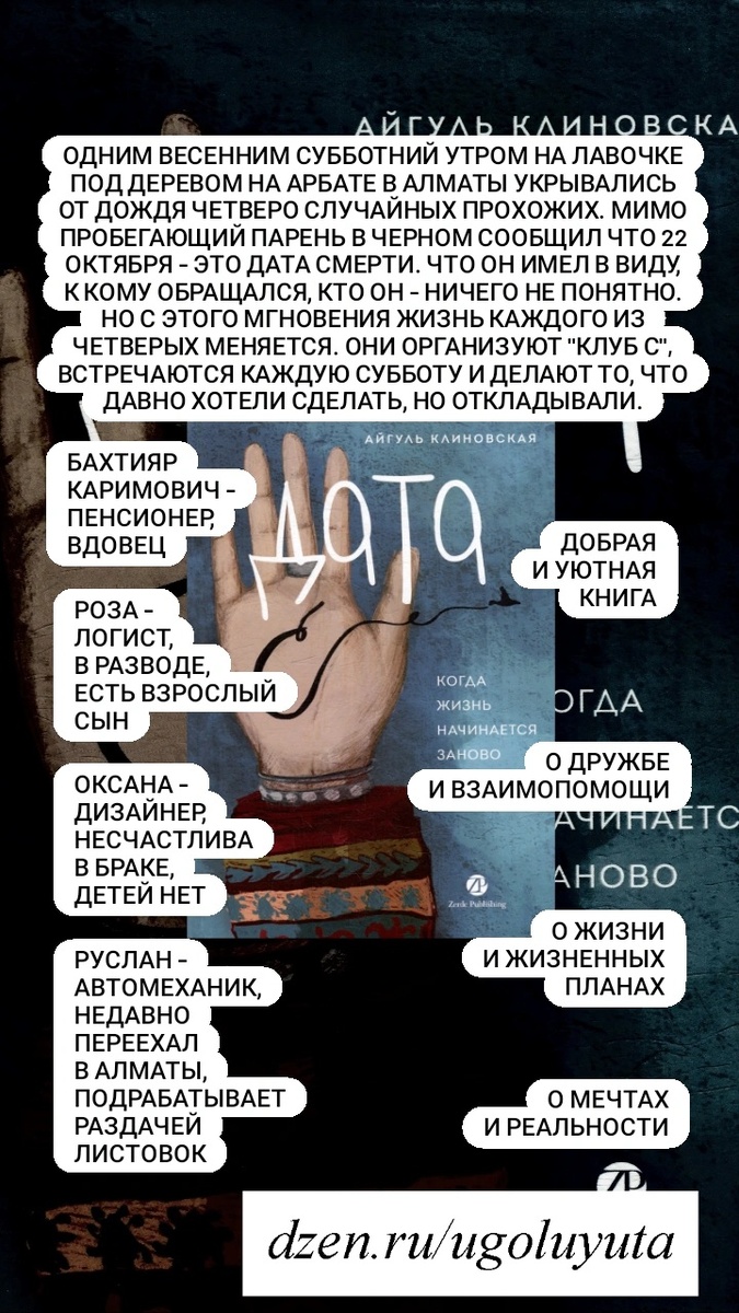 Прочитала книгу "Дата С". Очень добрая, в стиле Клер Пули. Есть что-то похожее на "Правдивую историю" и "Люди с платформы номер 5", но с русско-казахским колоритом (действие происходит в Алматы). Если кому-то нужна тёплая и жизнеутверждающая книга - она самое то.