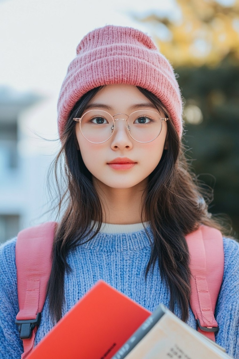 Создано на основе запроса: asian teenage geek, with round glass and beanie hat, dressed in geeky american college attire carrying books in