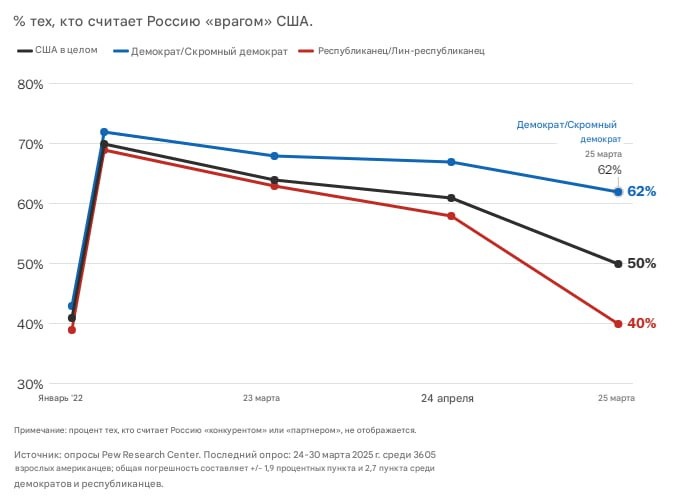 🇺🇸 Всё меньше американцев считают Россию «врагом», опрос Pew Research Center