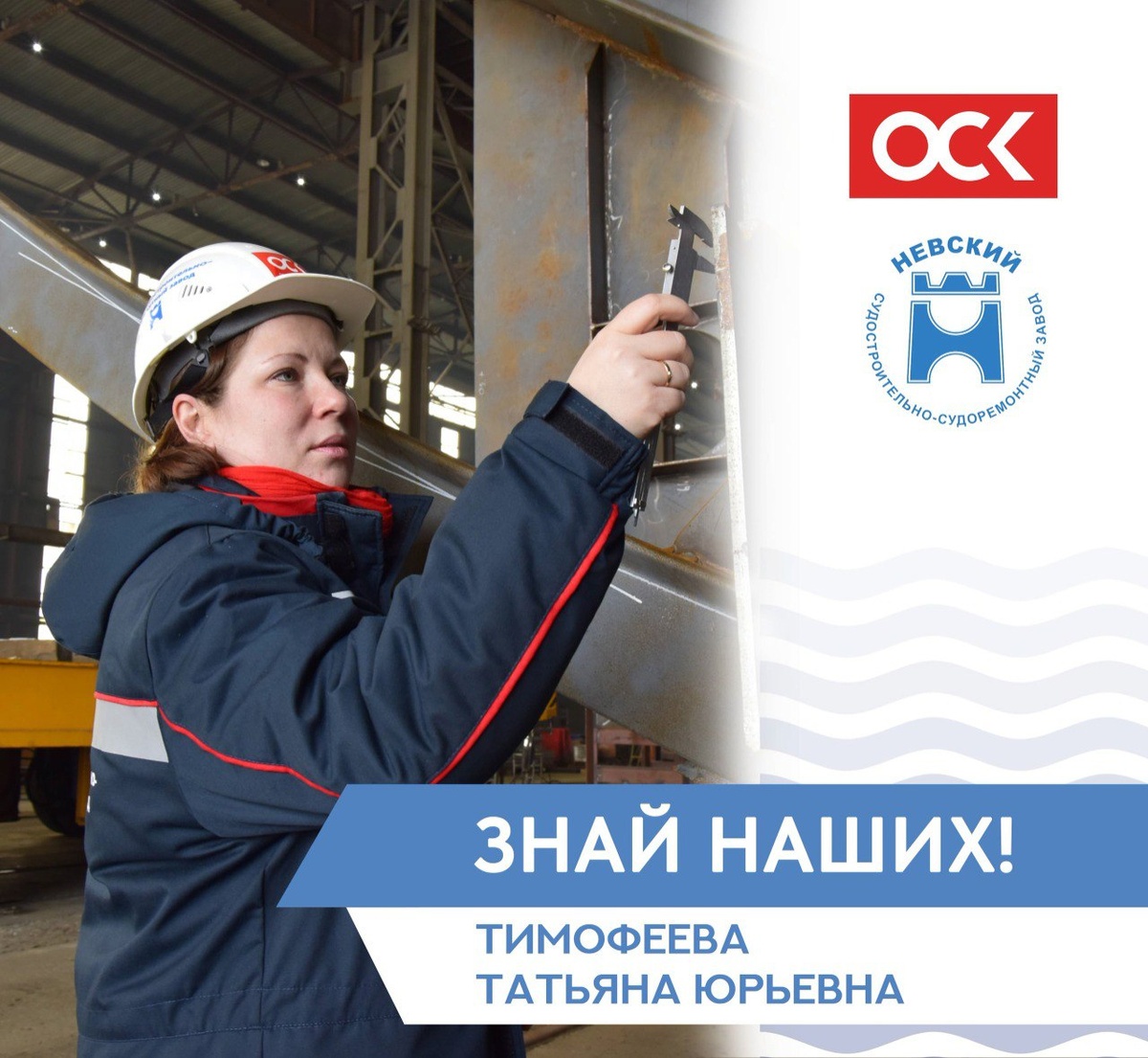 Татьяна Юрьевна Тимофеева - начальник отдела контроля качества на предприятии ОСК Невский ССЗ.В 2004 году Татьяна Юрьевна окончила Санкт-Петербургский Государственный университет водных коммуникаций по специальности «судовые энергетические установки» и получила необычную для девушек квалификацию - «морской инженер». Её карьера началась в порту, в отделе судового хозяйства. Затем в течении шести лет она работала экспертом в Российском классификационном обществе (РКО). С 2021 года Татьяна Юрьевна работает на предприятии ОСК Невский ССЗ, сначала заместителем начальника отдела контроля качества, а через полгода возглавила отдел. В основные задачи отдела контроля качества входит мониторинг качества поступающего оборудования и материалов, в так же контроль выпускаемой продукции на всех этапах производства. Выполнять свои функциональные задачи и обязанности Татьяне Юрьевне помогают умение сохранять спокойствие в стрессовых ситуациях, профессионализм, глубокие знания и умение находить общий я