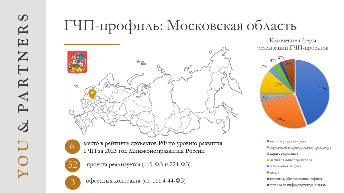🏆 Место в рейтинге Согласно итоговой оценке рейтинга субъектов РФ по уровню развития ГЧП за 2023 год (Минэкономразвития России), Московская область занимает 6 место (поднявшись на 16 позиций по сравнению с 2022 годом). Наиболее интересные проекты, планируемые к реализации на территории Московской области: 🐟 Создание кластера индустриальной аквакультуры в Раменском городском округе. 🏒 Строительство и эксплуатация многофункционального спортивного комплекса с ледовой ареной. 🧮 Количество проектов По данным РОСИНФРА в регионе реализуется 52 ГЧП-проекта (учтены проекты по 115-ФЗ и 224-ФЗ на стадиях от предынвестиционного этапа до завершения проекта). 🧩 Сферы реализации проектов: Проекты реализуются в следующих сферах: - городской и пригородный транспорт (14 проектов); - жкх и городская среда (23 проекта); - здравоохранение (2 проекта); - магистральный транспорт (6 проектов); - социальная защита (1 проект); - спорт (2 проекта); - торговля, обслуживание, офисы (1 проект); - цифровая инфр