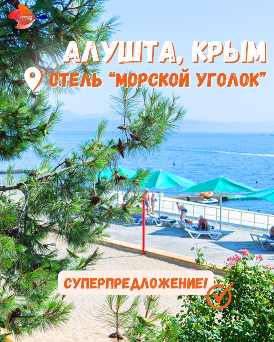 💥СУПЕРпредложение на выезд 13.06! 🌴Курортный отель «Морской уголок» расположен в знаменитом курортном месте Алушты - Профессорском уголке 👍Преимущества: ✅ Собственный пляж в 25 метрах с розовой галькой! ✅ 3-разовое питание «шведский стол» ✅ Детская игровая инфраструктура ✅ Все номера с балконами с видом на Чёрное море! 💸СТОИМОСТЬ - 28 570 рос.руб. (ориентировочно 350$) – отдых 15.06-25.06 / 1 чел. *при 2-местном размещении 🔥В стоимость входит: проживание 11 дней/10 ночей, 3-разовое питание по системе «шведский стол» *Проезд в Алушту – оплата дополнительно. 170$+130BYN, детям скидки! 👇Подробности у специалистов! 📞+375 (29) 749-00-25 (МТС, viber) 📞+375 (29) 302-18-64 (A1, telegram)