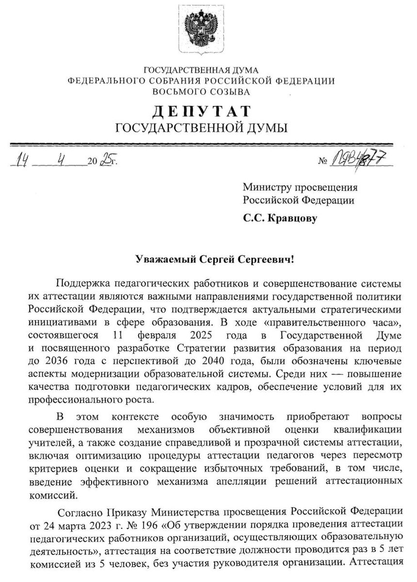 📝Предложила пересмотреть критерии аттестации педагогов 📥Направила такое обращение министру просвещения РФ Сергею Кравцову. ℹ️С 2023 года в России внедрена новая система аттестации с использованием Единых федеральных оценочных материалов, которые оценивают профессиональные, предметные и коммуникативные компетенции, однако педагоги сталкиваются с трудностями во время аттестации. ⤵️⤵️⤵️ Речь о невозможности оперативного повторного прохождения процедуры и об отсутствии механизма обжалования решений. 🟣В существующей системе есть избыточные требования, не связанные напрямую с преподаванием - например, проверка навыков в документообороте и административных задачах, что усложняет процесс и снижает объективность оценки. ❗️Надо оптимизировать критерии оценки, сократив влияние административных навыков, или вынести их в отдельный блок для управленческих должностей, а также ввести действенный механизм апелляции, позволяющий педагогам оперативно оспаривать решения аттестационных комиссий.