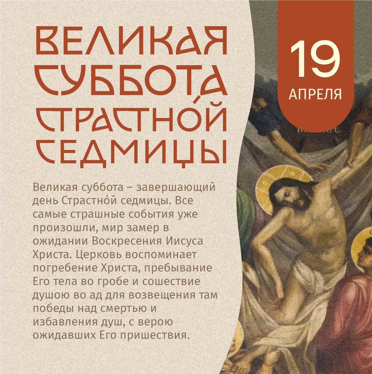 Великая суббота – завершающий день Страстнόй седмицы. Все самые страшные события уже произошли, мир замер в ожидании Воскресения Иисуса Христа. Церковь воспоминает погребение Христа, пребывание Его тела во гробе и сошествие душою во ад для возвещения там победы над смертью и избавления душ, с верою ожидавших Его пришествия.
