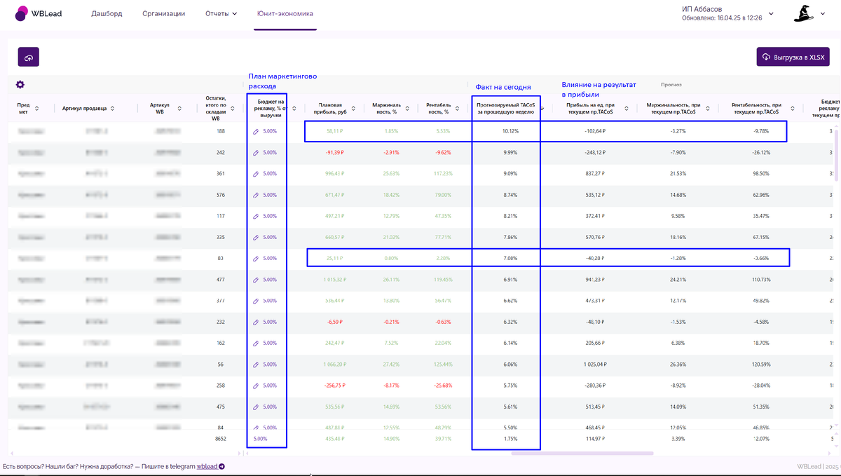 *скриншот из сервиса WBLead (статистика рекламы, РнП показателей кабинета, экономика)