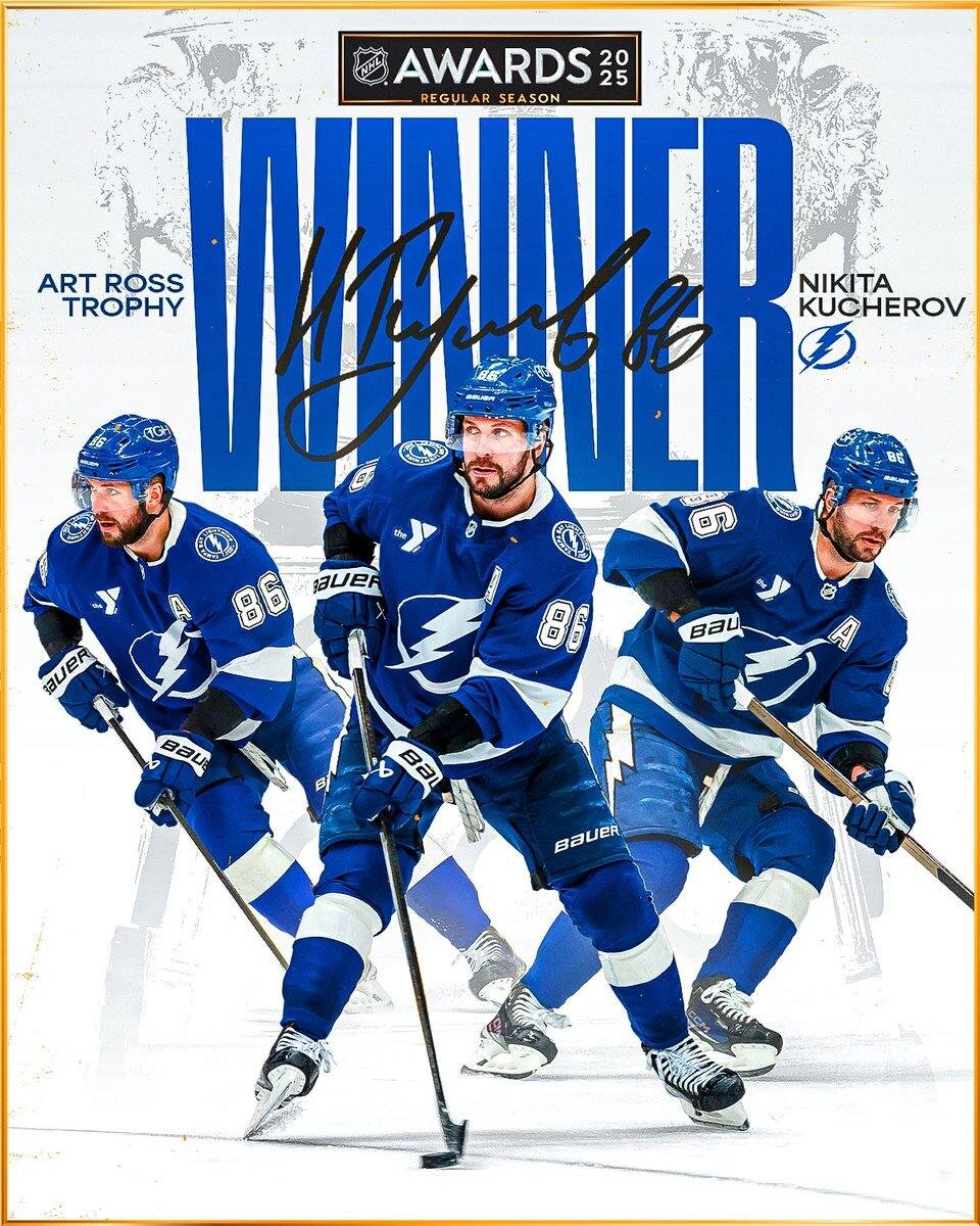 ⚡️Официально: Никита Кучеров – лучший бомбардир сезона-2024/25 🔝Россиянин набрал 121 (37+84) очко в 78 играх НХЛ. Он выиграл «Арт Росс Трофи». @onetitle