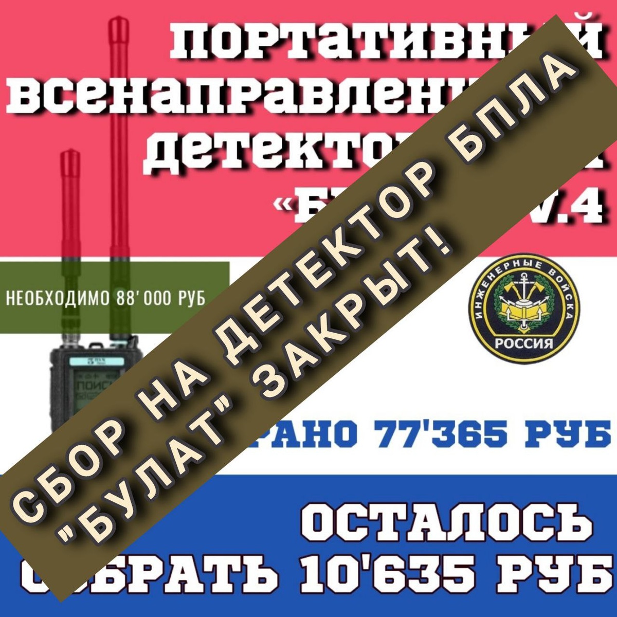 Друзья, сбор на "Булат" закрыт!!! Спасибо огромное всем за поддержку! И, конечно, спасибо Анастасии Сергеевне Х. - зафиналила сбор. 🙏 "Булат" будем заказывать и оплачивать на днях. 60 дней на изготовление. На практике - меньше. Хочется, чтобы парни уже получили необходимую технику. Пусть она им помогает в выполнении поставленных боевых задач и сохранит жизнь! Переходим к следующей задаче от инженерно-саперной роты.