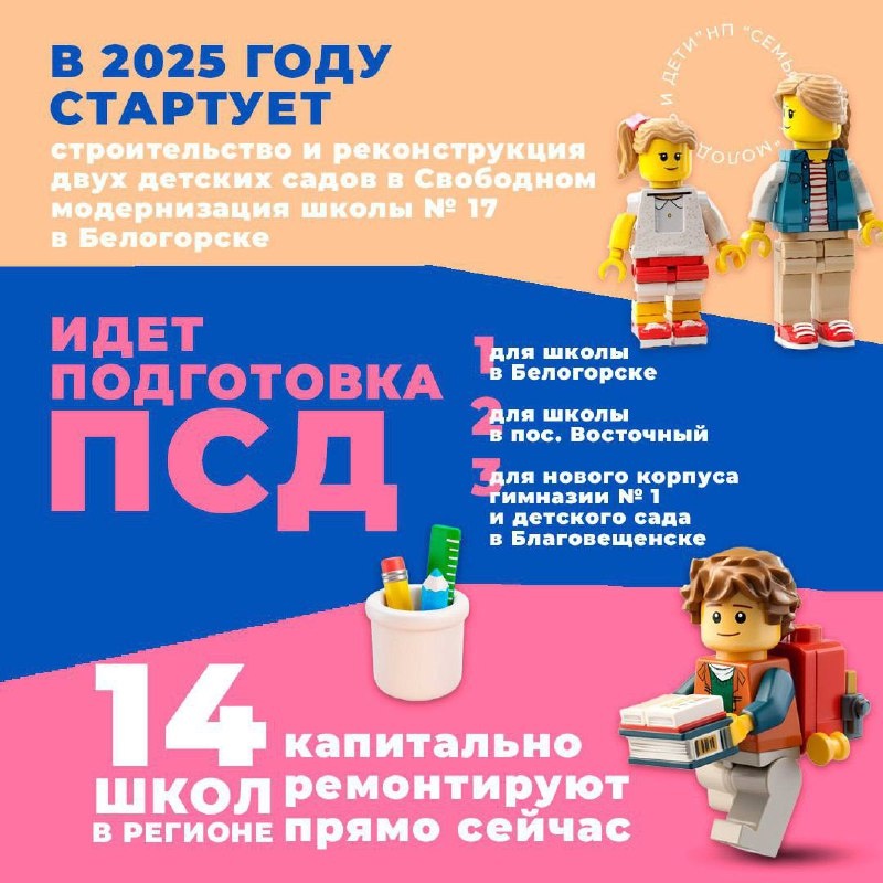 В 2025 году в Амурской области появятся две новые школы, и капитально отремонтируют более десяти «Обеспечение детей качественным образованием – одна из приоритетных задач. Поэтому власти Амурской области активно инвестируют средства в модернизацию учебных заведений и создание новых образовательных пространств. Это важный шаг вперед, направленный на улучшение условий обучения подрастающего поколения и повышение общего уровня жизни населения», – отметила председатель комитета Заксобрания по вопросам бюджетной, налоговой и социальной политики Валентина Калита. Подробнее – в карточках.